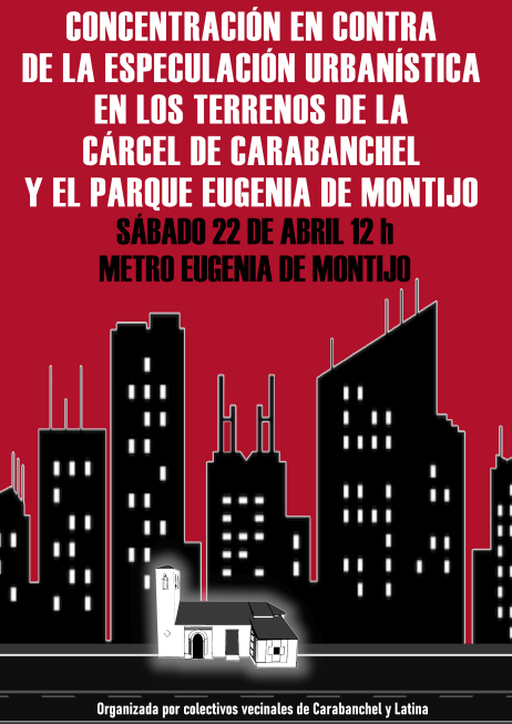 El próximo sábado 22 de abril se celebrará una concentración en contra de la especulación inmobiliaria en los terrenos de la Cárcel de Carabanchel y el Parque de Eugenia de Montijo organizada por varios colectivos vecinales de los distritos de Carabanchel y Latina. Comenzará en la estación de Metro de Eugenia de Montijo a las 12 h.