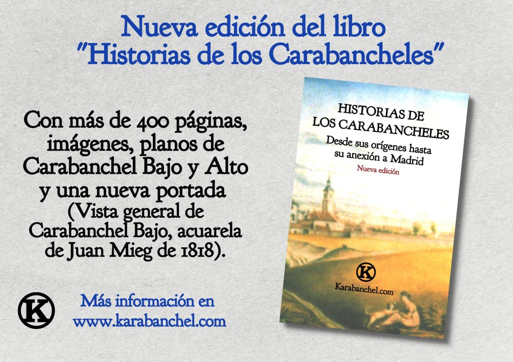 Ya está disponible la nueva de edición del libro «Historias de los Carabancheles. Desde sus orígenes hasta su anexión a Madrid» en las librerías y algunos kioscos de prensa de Carabanchel y en la librería Santander (Aluche). La nueva edición tiene más de 400 páginas, imágenes, los planos de los cascos históricos de Carabanchel Alto y Bajo en 1900 y una nueva portada (la acuarela Vista general de Carabanchel Bajo pintada por Juan Mieg en 1818). Estos son los puntos de venta del libro: