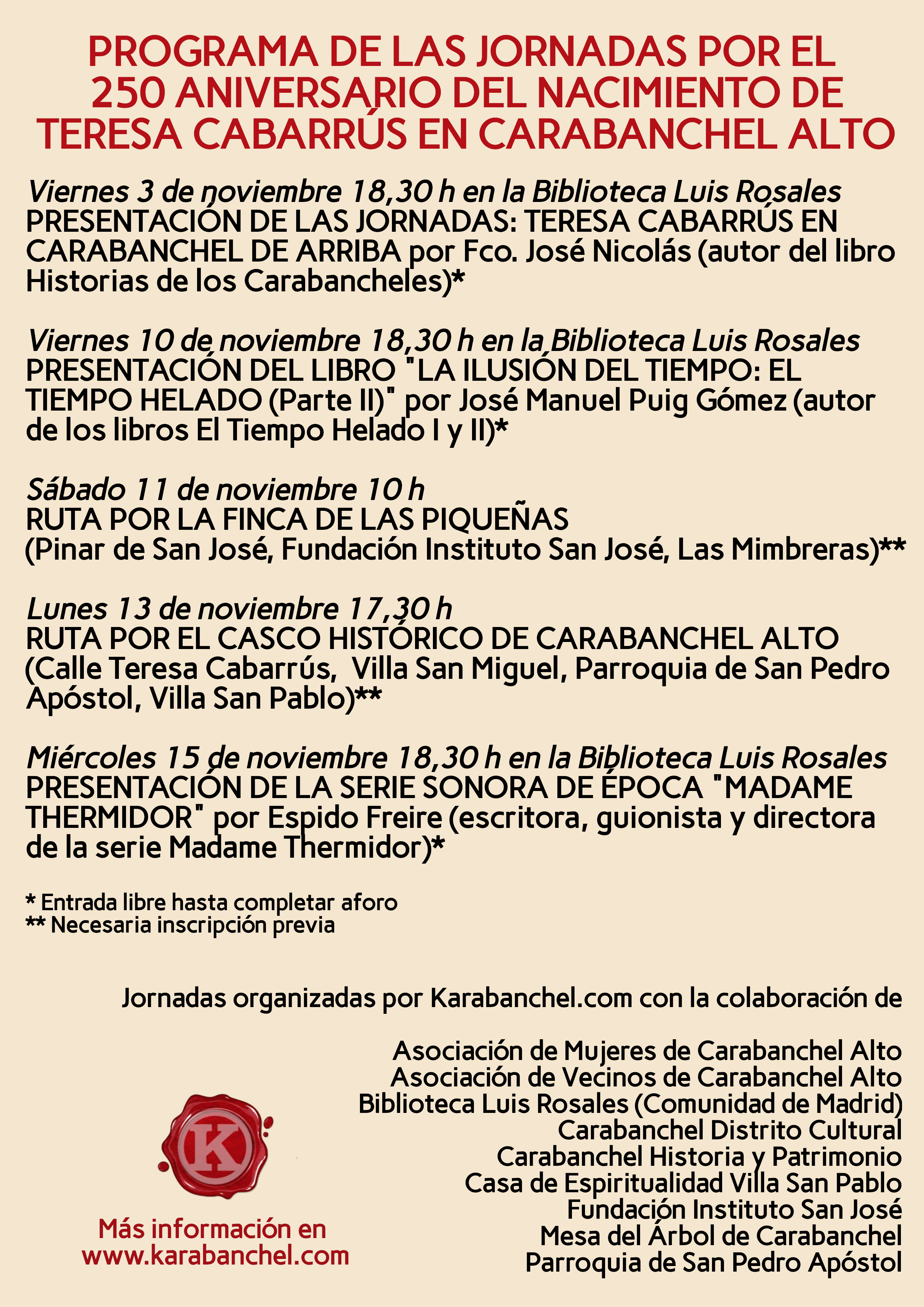 Las rutas forman parte de las Jornadas por el 250 aniversario del nacimiento de Teresa Cabarrús en Carabanchel Alto y son gratuitas. Han sido organizadas por Karabanchel.com con la colaboración de la Fundación Instituto San José, la Mesa del Árbol de Carabanchel, la Casa de Espiritualidad Villa San Pablo y la Parroquia de San Pedro Apóstol.