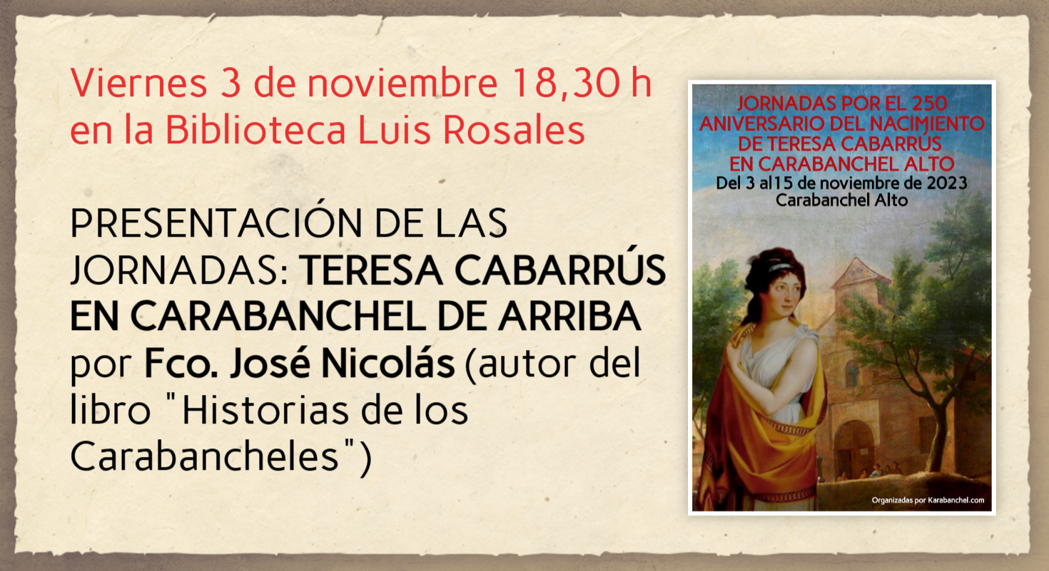 Esta es la presentación del primer acto de las Jornadas por el 250 aniversario del nacimiento de Teresa Cabarrús en Carabanchel Alto celebrado el 3 de noviembre en la Biblioteca Luis Rosales.