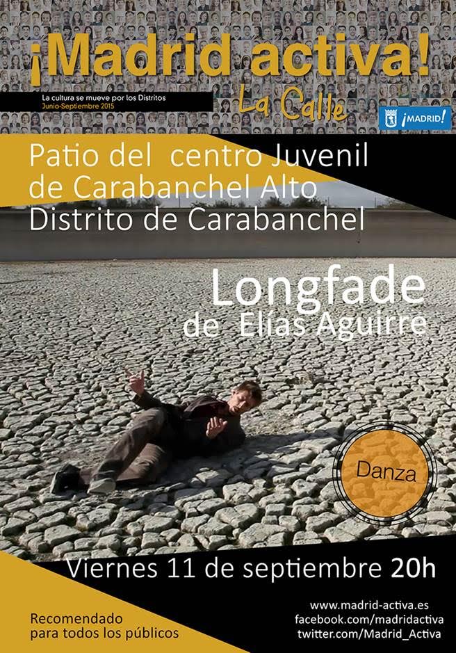 El viernes 11 de septiembre a las 20 h dentro del ciclo ¡Madrid Activa! del Ayuntamiento de Madrid la compañía de Elías Aguirre representará la danza «Longfade». Longfade ha obtenido el premio al mejor material coreográfico en el certamen de UNIDANZA 2012, Madrid. Hasta el momento se ha representado en Festivales de España, Brasil, Nueva Zelanda y Vietnam.