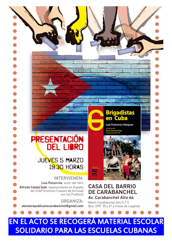 El próximo jueves 5 de marzo a las 19,30 h tendrá lugar en la Casa del Barrio la presentación del libro “Brigadistas en Cuba”, a cargo de su autor, Luis Puicercús, y con la participación de Alfredo Catalá Solé, representante del Instituto Cubano de Amistad con los Pueblos (ICAP)