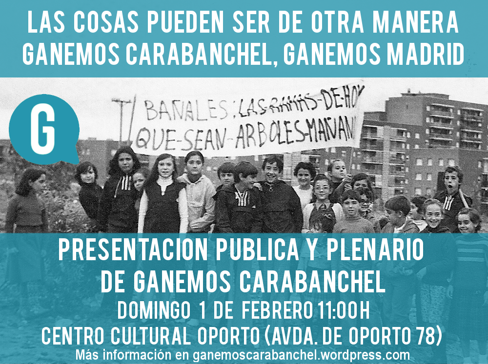 El próximo domingo 1 de febrero a las 11:00 h se celebrará la presentación pública y plenario de Ganemos Carabanchel, el grupo local de Ganemos Madrid en el distrito de Carabanchel, en el Centro Cultural Oporto (Avda, de Oporto 78).