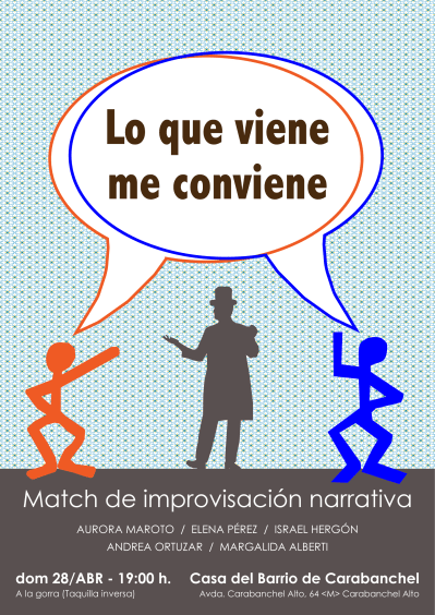 «¡¡¡ Bienvenidos y bienvenidas al match de improvisación narrativa «Lo que viene me conviene» !!! Un espectáculo inigualable, incomparable, irrepetible, inenarrable e inolvidable. Un show donde el público propone diferentes elementos para que los equipos de narradores creen historias en vivo y en directo. Y, además, decidirá quién acaba siendo el ganador. ¿Te vienes a disfrutar y ser árbitro de este peculiar partido?»