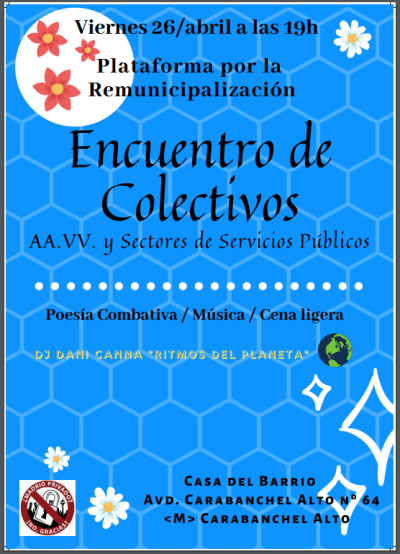 El viernes 26 de abril vamos a tener un encuentro de los diversos colectivos de servicios municipales de gestión privada para conocer la situación actual, hacer balance de la legislatura que acaba (presentación de un informe de la plataforma) y preparar la que va a dar comienzo, con el objetivo de mantener la lucha por la remunicipalización de los mismos.