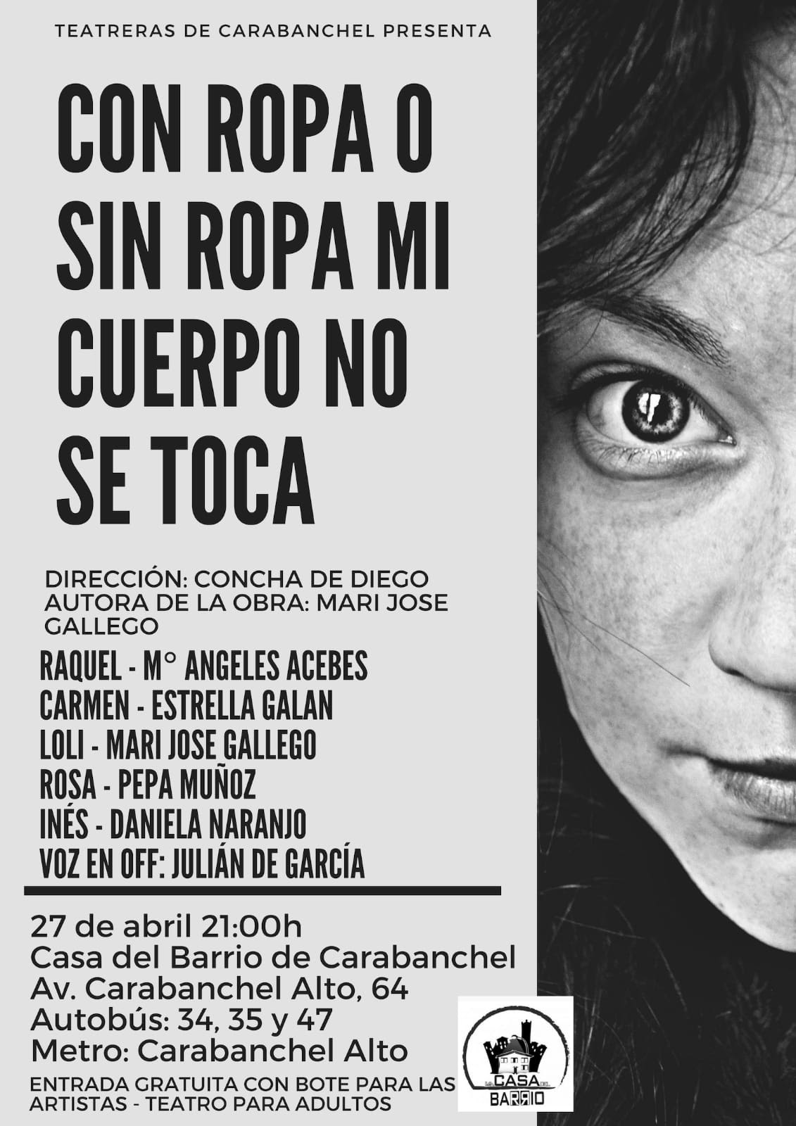 Sábado 27 a las 21 h: Representación teatral: «Con ropa o sin ropa mi cuerpo no se toca» (Teatreras de Carabanchel)